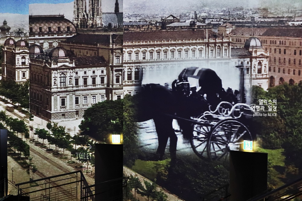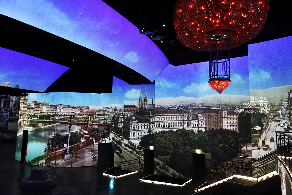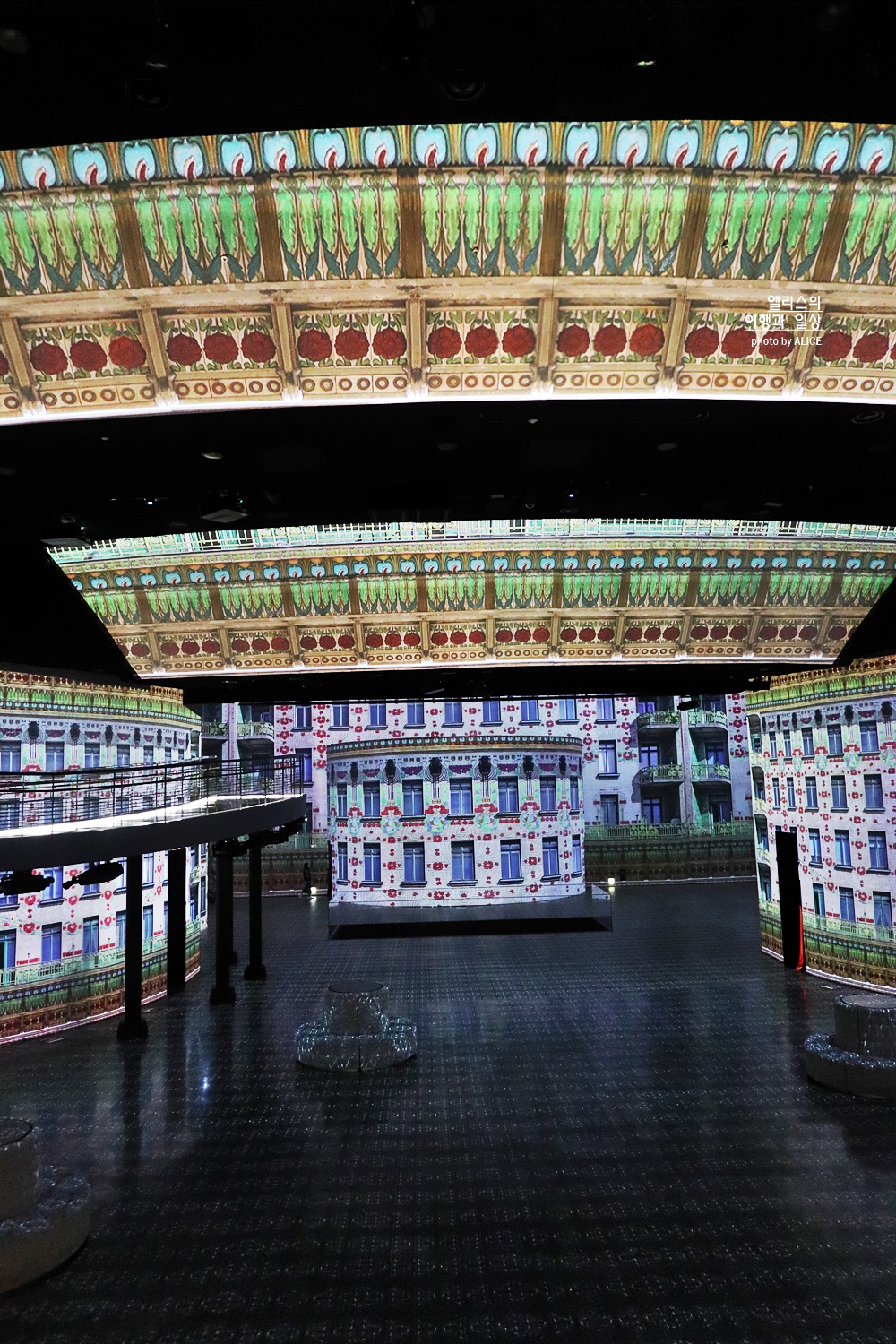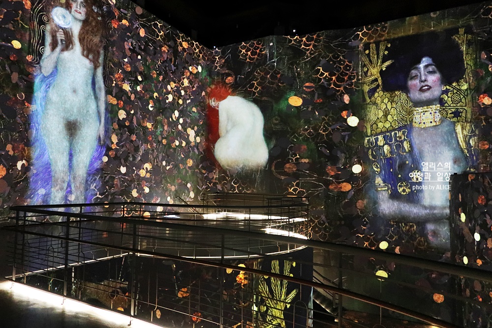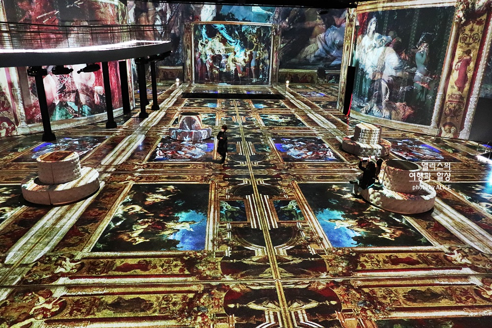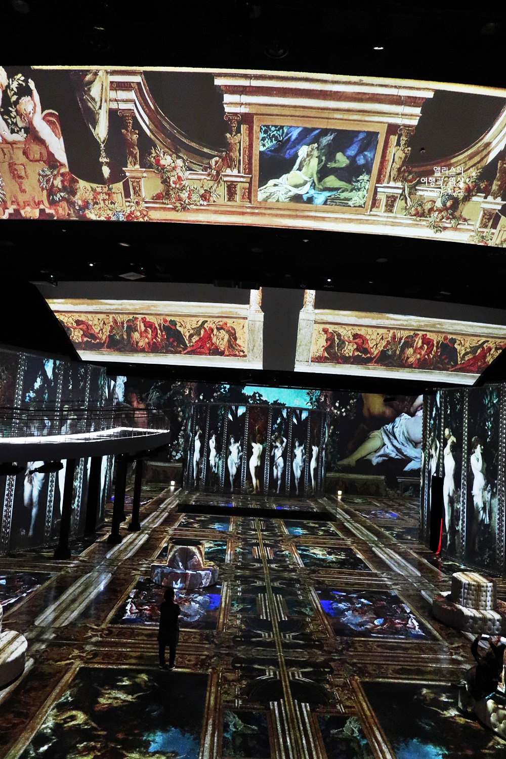 사진에서 보다시피 2층와 1층으로 나뉘며 2층은 왼쪽으로 이동하며 온 벽면에 채워지는 생동감있게 다양한 명화를 감상할 수 있다