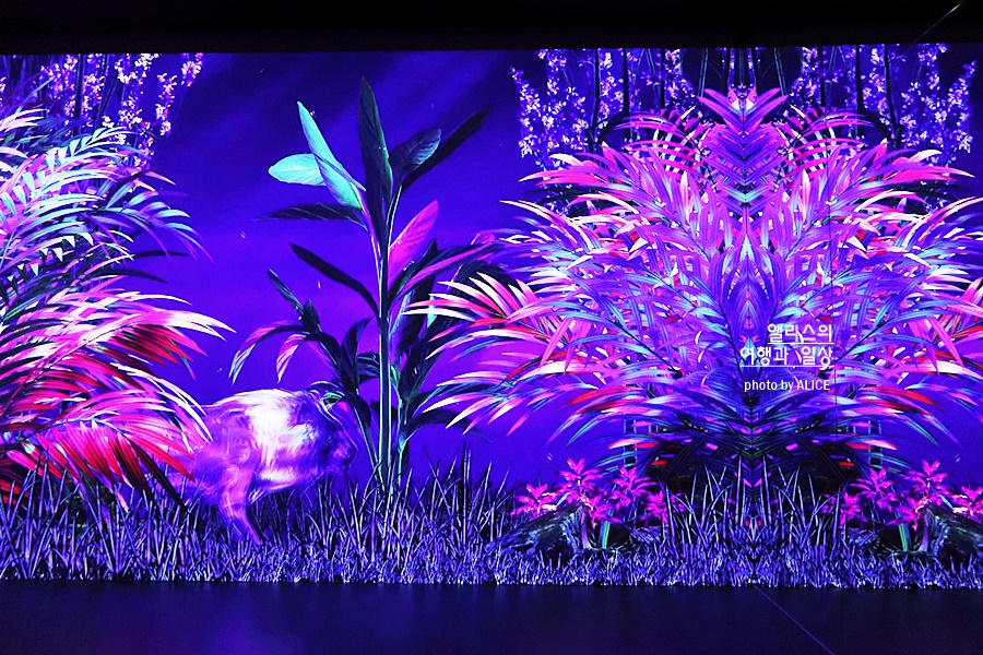 분명 정글인데 비현실적으로 색채가 화려하다. 그 화려한 색채 식물들 사이에서 오가는 자연의 동물. 사파리에서나 볼 법한 야생 동문들이 끊임없이 나타나고 이동한다.
