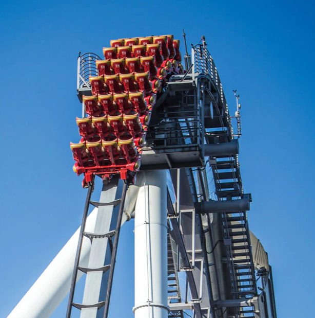 43m 높이까지 거꾸로 올라간 후 하늘을 올려다보면서 머리 뒤부터 엄청난 속도로 떨어진다. 어디로 갈지 알 수 없는 예측 불가능한 최고의 스릴과 무언가를 꽉 붙들고 싶어지는 충격. 머리 뒤에서 세차게 불어오는 돌풍이 스피드가 얼마나 빠른지를 알려준다.