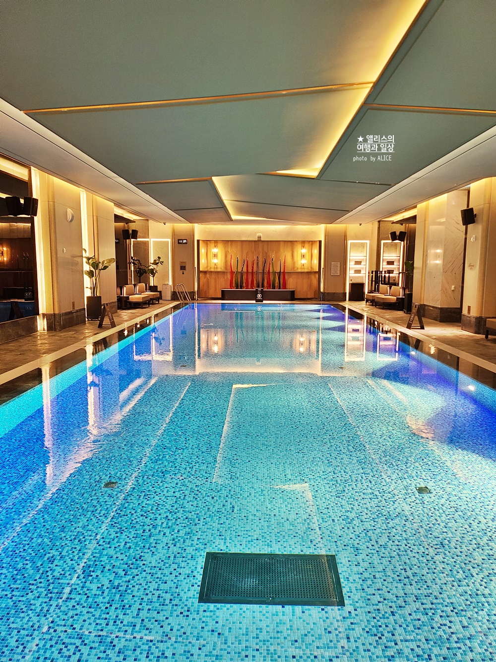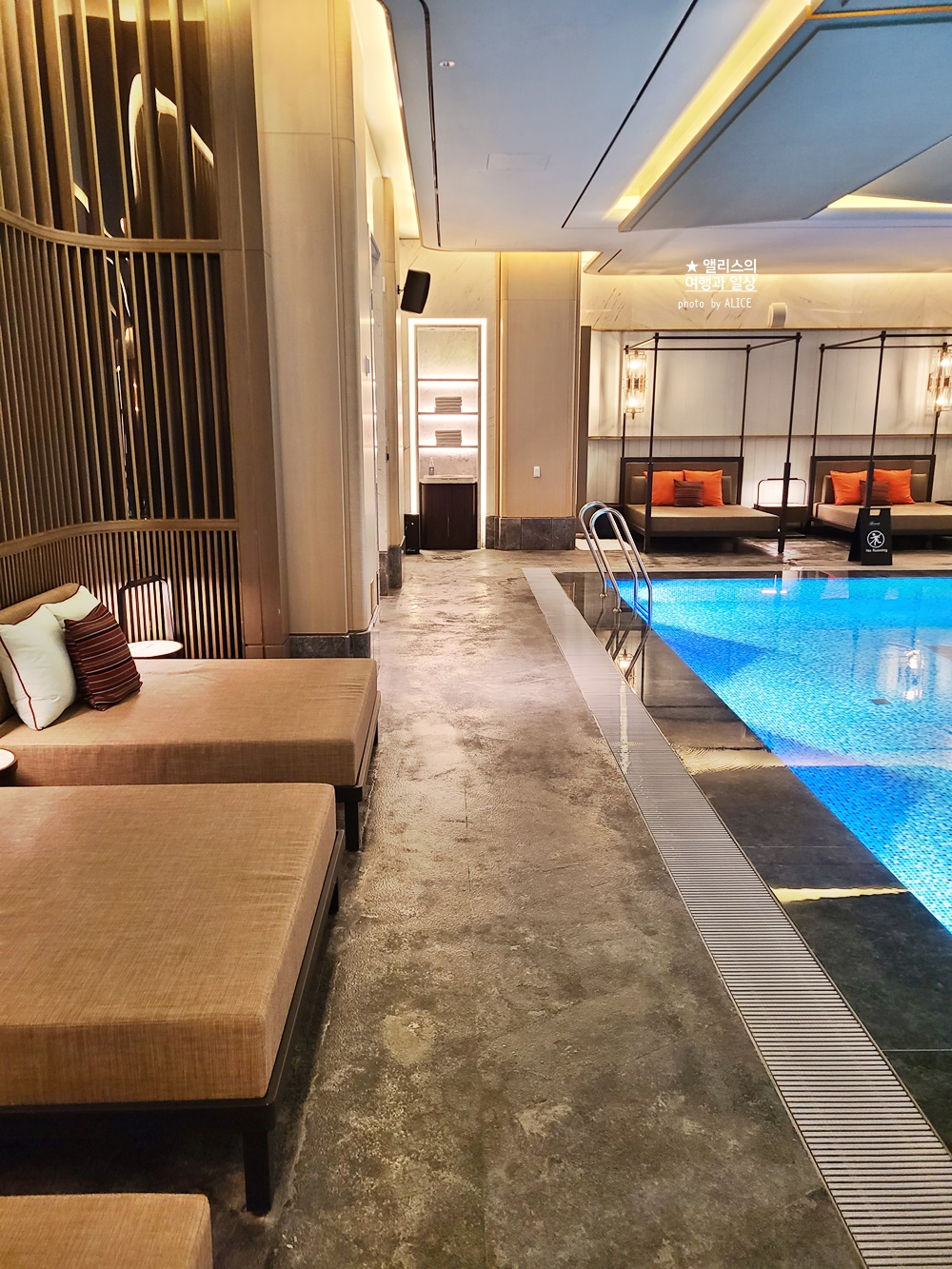 피트니스센터와 실내 수영장, 에스파 앳 페어몬트 스파를 갖추고 있는 페어몬트 앰배서더 호텔 서울. 조명으로 화려함을 더했지만 가볍지 않다. 고요하게 흐르는 물 소리만 들리는 페어몬트 실내 수영장. 수영장 예쁜 호텔 중 하나로 꼽히는 이유는 이 고요함과 적당한 무게감이 화려한 느낌을 오히려 더해주기 때문이 아닐까 싶다. 미온수로 채워져있어서 겨울에도 수영이 즐거운 곳!