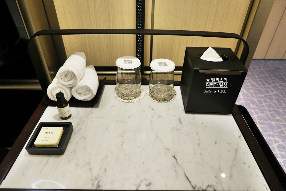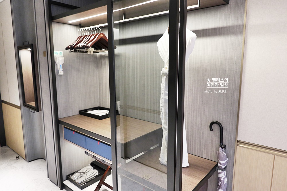 객실 내 편리한 시설이라는 점은 직접 지내보니 알 수 있었다. 비록 티백이 제공되지만 별도의 다도찻잔이 갖춰져있고 침대 바로 옆 협탁은 둥글지만 넓은 공간에 필요한 편리한 전자기계등이 있어서 편안한 휴식공간으로서 편리하게 이용할 수 있었다. 침실이 넓은 만큼 별도의 욕실도 공간이 충분히 넓었고 시스템 옷장으로 복도는 좁지 않도록 동시에 편리하게 수납장을 활용할 수 있도록 했다.