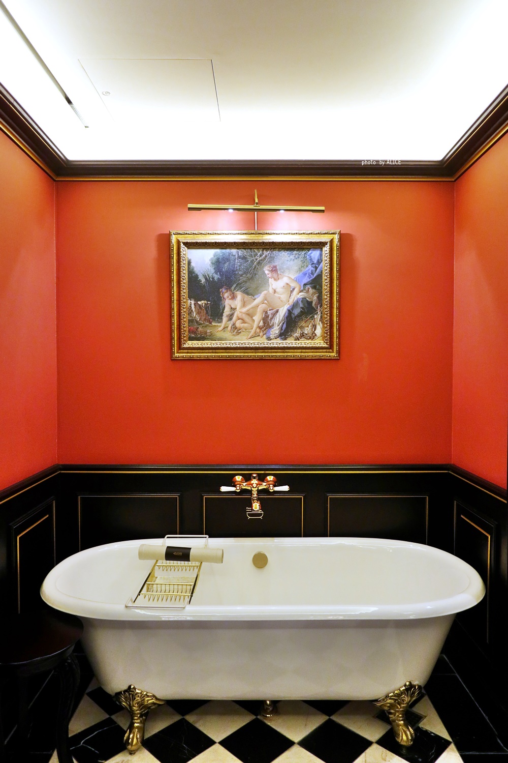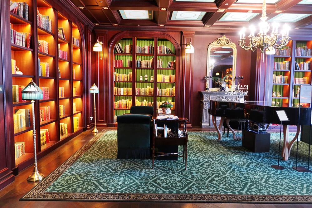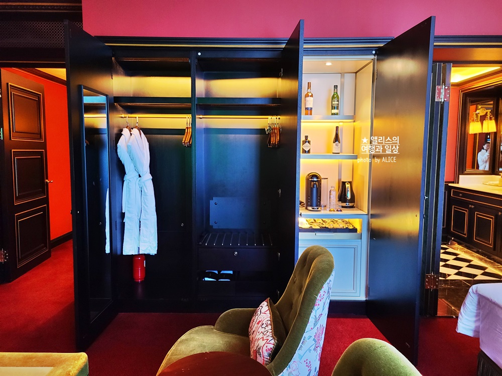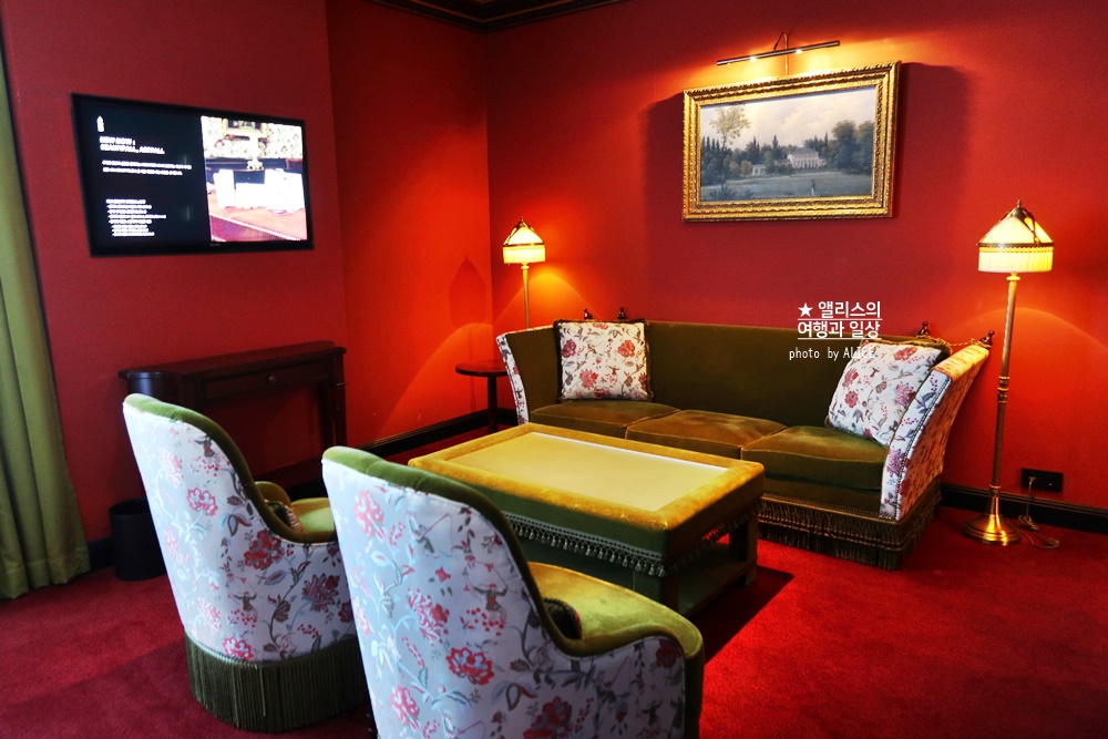 객실 입구에 들어서자마자 보이는 복도 공간 여기 그냥 두지 않았다. 왕실에 있을 것 같은 액자와 함께 앤틱 한 조명이 복도 공간을 밝힌다. 넉넉한 공간의 욕실에는 별도의 건식 형태의 욕조를 앤틱하게 이용할 수 있고 침실의 화려한 캐노피는 마치 내가 유럽의 한 고성에 온 것은 아닌가 싶은 느낌을 주기도 한다. 소파에 앉아 충분히 즐거운 차담시간을 보내기도 할 수 있어서 무척 좋다.