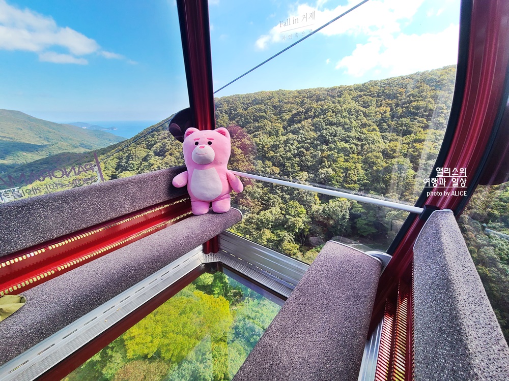 아주 재미나게도 거제 파노라마 케이블카에는 귀여운 밸리곰이 탑승해있다. 모든 케이블카에 밸리곰이 있어 간혹 밸리곰 혼자 케이블카를 탑승하게 되는 경우도 있다. 멀리서보면 저 멀리 풍경을 구경하고 있는 밸리곰이 어찌나 귀엽던지.