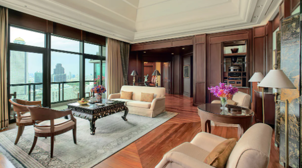 강이 정면으로 보이는 리버뷰 객실을 보유하고 있으며 품격 있는 앤틱 가구가 배치되어 있다. 본점 홍콩의 맛을 그대로 살린 캔토니즈 레스토랑 메이지앙(Mei Jiang), 전통 타이 레스토랑인 팁타라 (Thiptara), 전통 애프터눈 티 (오후 2시~6시)를 즐길 수 있는 더 로비 (The Lobby) 등에서 다양한 음식을 즐길 수 있다.