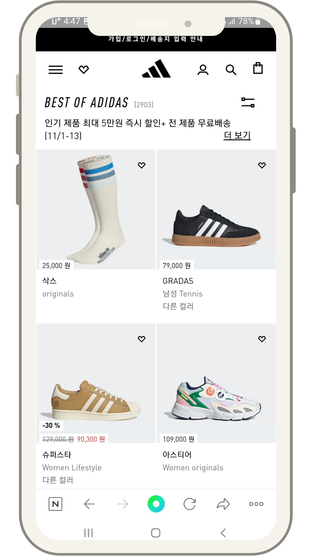 아디다스는 블프에 들어간 것은 아니지만 시즌오프 세일에 들어갔다. 무료배송은 물론 각 인기상품 최대 5만원 즉시 할인된 가격에 구매 가능하다. 그리고! 최종 결제단계에서 추가로 9% 할인받을 수 있는 쿠폰도 있다는 사실~! 아! 아디다스 신규회원은 별도의 10% 할인쿠폰도 받을 수 있으니 꼭 챙기시길