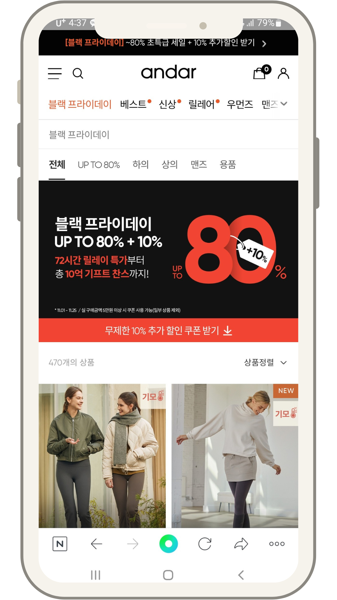 안다르는 72시간 릴레리 특가부터 최대 80% 할인이벤트에 돌입했다. 블랙프라이데이 세일을 통해서 평소에 구매할 수 있는 운동복 대부분이 세일에 참여하고 특가를 통해 애슬레저의 확대를 노리고 있는 것이 특징.