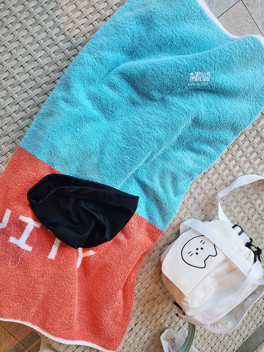 가운을 제공한다는 점이 무척 마음에 든다. 별생각 없이 래시가드 챙겨 입고 내려와서 수영하고 나서 다시 올라가려니 젖은 래시가드를 입어야 했다. (객실 가운을 못 챙겨 옴...;;;) 그런데 이렇게 별도의 가운을 무료로 제공하고 있으니 정말 좋았다.