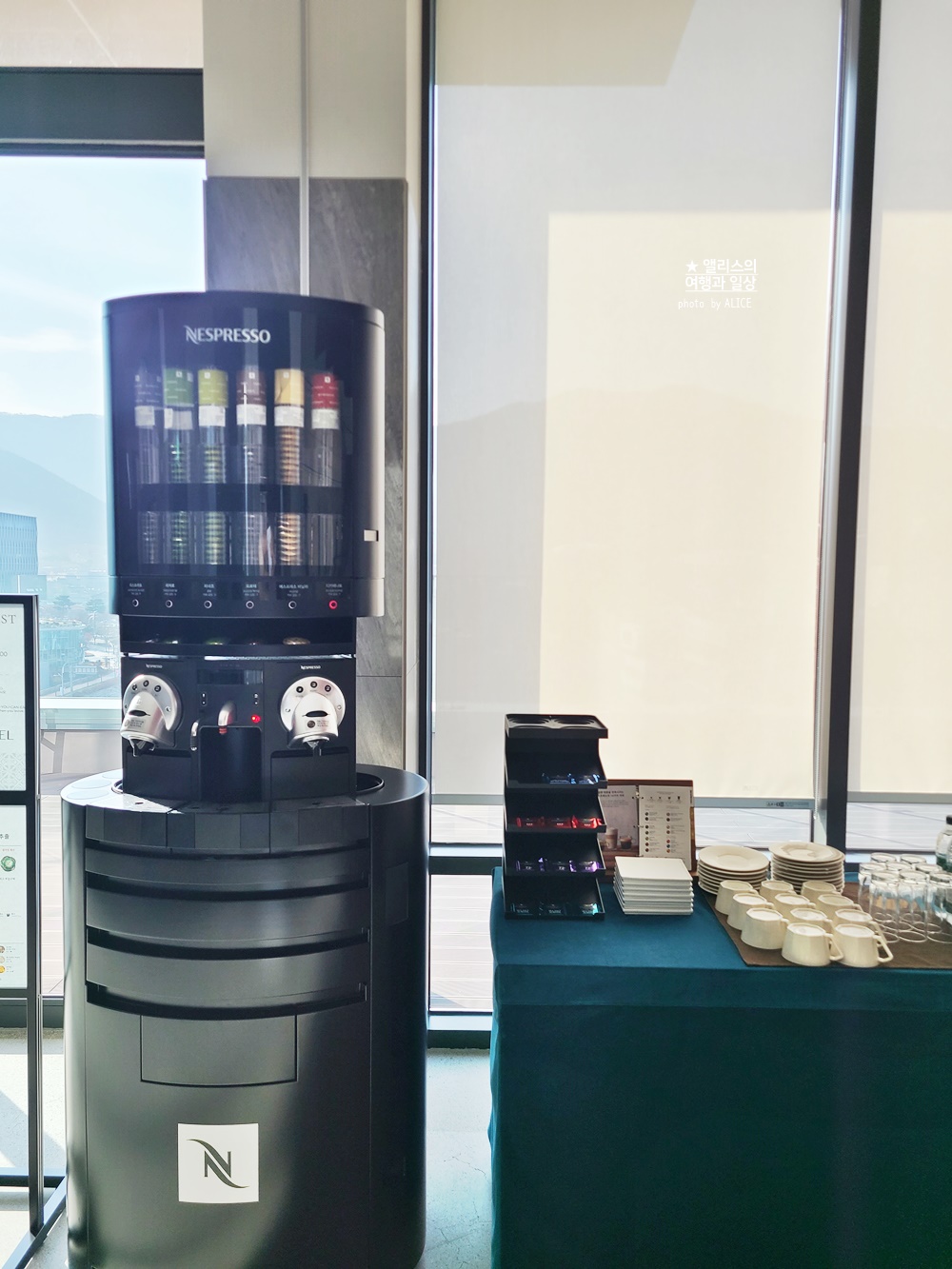 간단하게 음료와 초콜릿 등을 먹고 마시며 쉴 수 있는 공간이다. 보다시피 공간도 넓고 네스프레소 머신이 있어서 원하는 종류의 커피도 선택 가능하다. 휴식공간이 다양하고 넉넉해서 모든 일정을 마치고 잠시 스카이라운지에서 쉬는 것도 꽤나 좋은 선택인 듯!