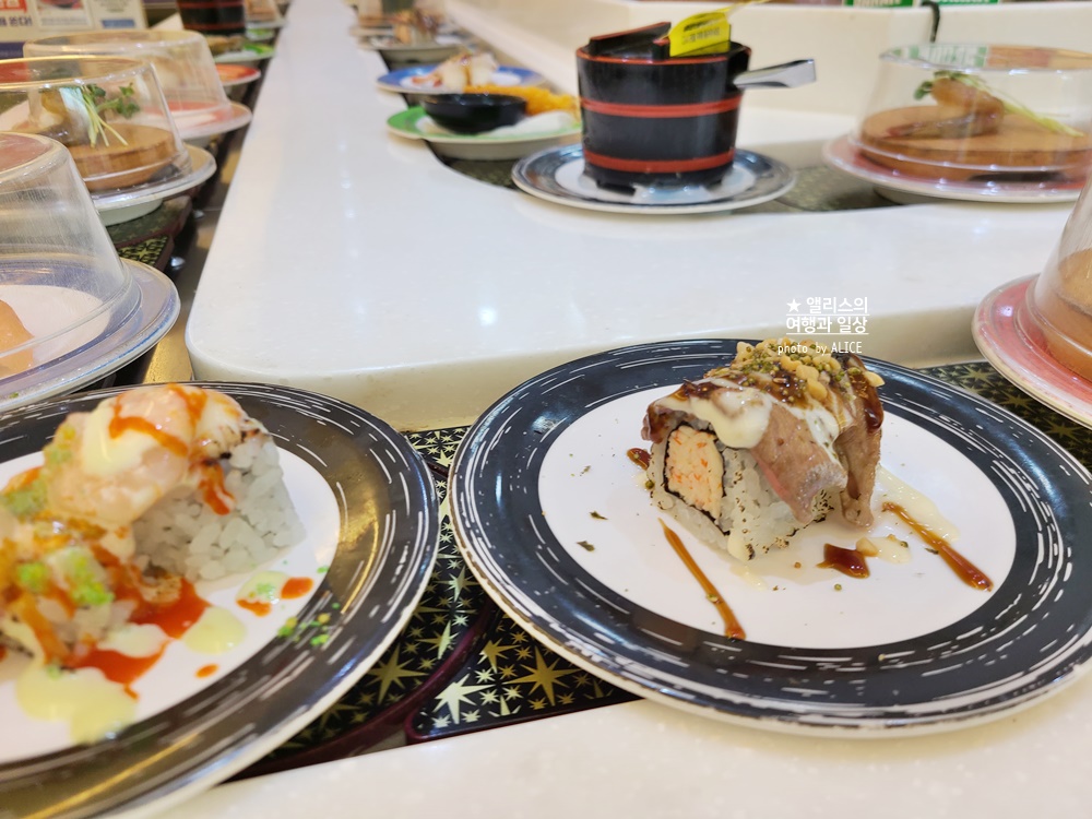 아주 특별한 3~4가지 정도만 제외하면 모든 메뉴는 각 접시당 2,200원으로 일괄 가격이 적용된다. 그래서 계산하기도 편리하고 가성비도 좋다. 2,200원에 대하 초밥 메뉴만 해도 5가지는 넘는 것 같다. 마침 새우를 좋아하는 나로서는 아주 안성맞춤 가성비 회전초밥집인 셈.