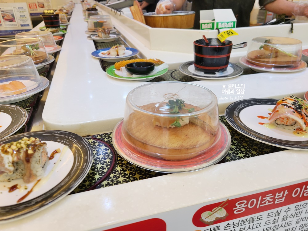 초밥이라는 것이 가성비부터 고급까지 다양하게 선택할 수 있다. 동래역 바로 앞에 있는 용이초밥. 가성비 좋은 회전초밥집이다. 원하는 종류 갯수를 취향껏 선택할 수 있고 런치가 제법 가격대비 괜찮게 잘 나와서 나 역시 종종 먹으러 간다. 메뉴는 아래 사진에 찍은 것보다 훨씬 더 다양하지만 내 취향대로 먹은 결과이니 참고만 하시길~