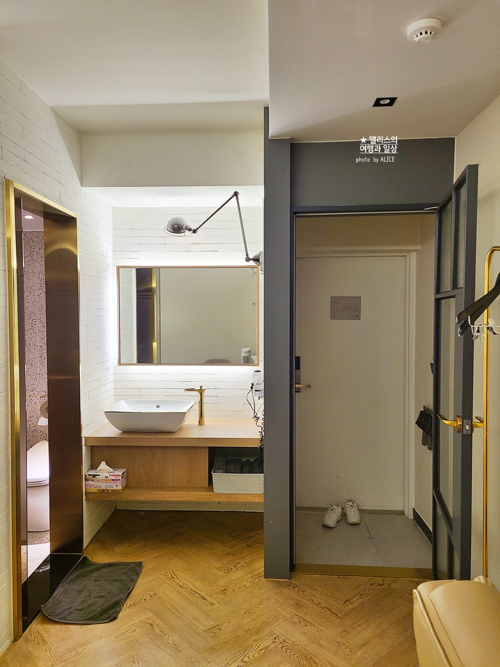 욕실의 경우 전체 메인 색깔은 골드. 그만큼 이 소재는 빨리 닳는 것이 눈에 보이는 소재라 신축 호텔임에도 반짝이는 느낌보다는 닳은 느낌이 든다. 이건 소재의 특성일 뿐 이곳이 오래 되었거나 혹은 관리하지 않아서가 아니니 이해하시길. 골드가 예쁜데 관리가 어려움.