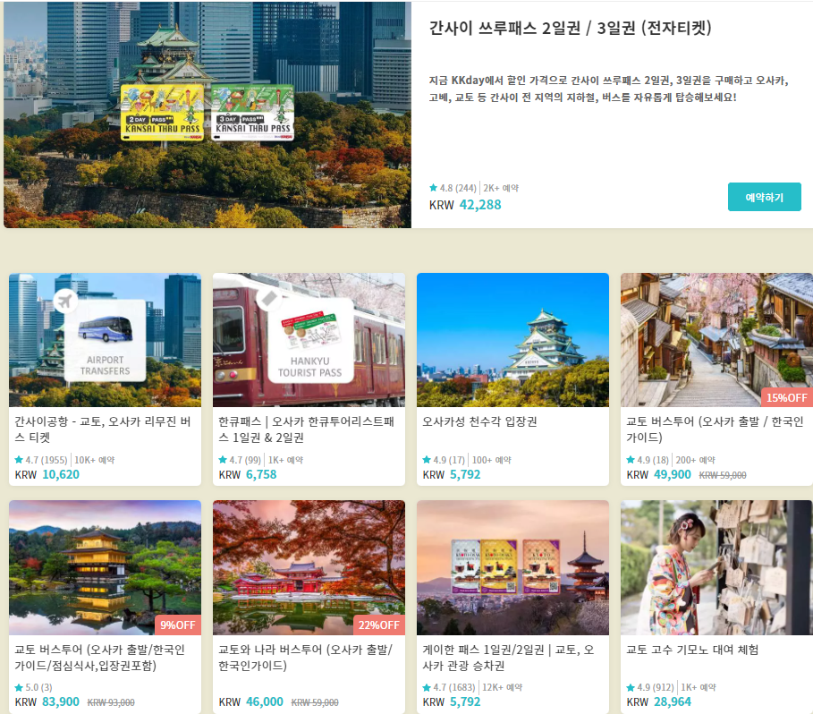 kkday에서 판매하는 일본 여행 상품 결제시 현대카드로 결제하면 최대 30% 할인받을 수 있다. 일본의 대표적인 여행상품인 교통패스는 물론 입장원, 체험권, 버스투어 상품 역시 할인대상이 된다. 범위가 광범위한 만큼 일본 여행을 준비중이라면 놓치지말고 이용해보자.