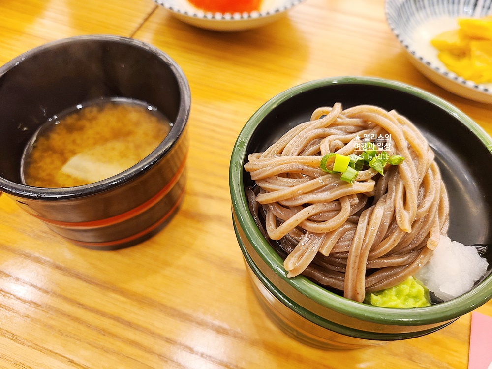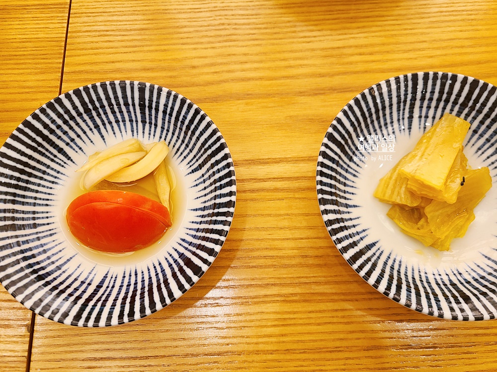 기본 세팅은 토마토+양파 절임, 묵은지 그리고 미소된장과 메밀이 제공된다.