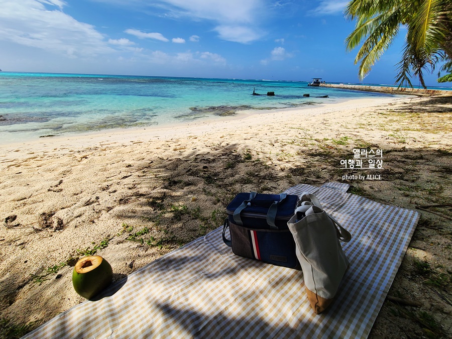 덕분에 오늘 오전에는 마나가하섬에 가서 아침 피크닉을 즐겼다. 남들 물놀이할 때 시원한 그늘을 찾아 투명한 바다를 감상하며 돗자리 깔고 스트레칭해주었다. 아주 기분 째져~ 간단하게 챙겨간 (요구르트/바나나/음료) 것으로 아침을 하고 책도 읽고! 캠핑 온 (사이판에 사시는) 분이 야자수 열매 땄다며 나한테 하나 건네주신다. 감사합니다~