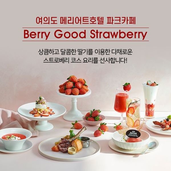 여의도 메리어트 호텔 파크 카페에서 운영하는 딸기 메뉴코스 요리를 경험할 수 있다. 상큼하고 매력적인 딸기를 활용한 런치코스로 이용할 수 있어서 인기가 많다.