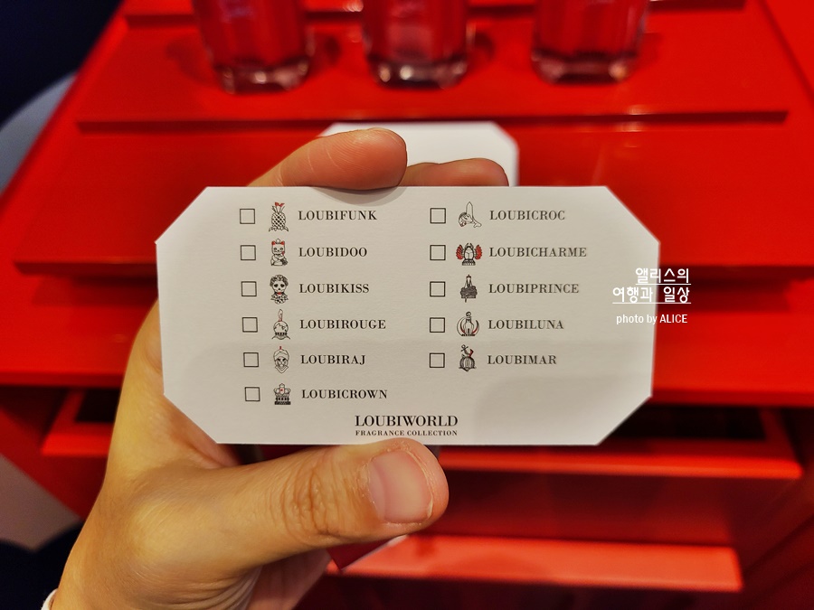 입장할 때 랜덤으로 향수 샘플(2mL)을 제공하는데, 내가 받은 랜덤 샘플은 바로 이 향수였다. 사진은 본품 중에서도 미니어처. 귀여운 고양이였는데 향수 이름은 LOUBIDOO였다. 직원이 내가 받은 샘플 향수를 시향 할 수 있도록 도와주었는데 맡아보니 아주 마음에 든다!