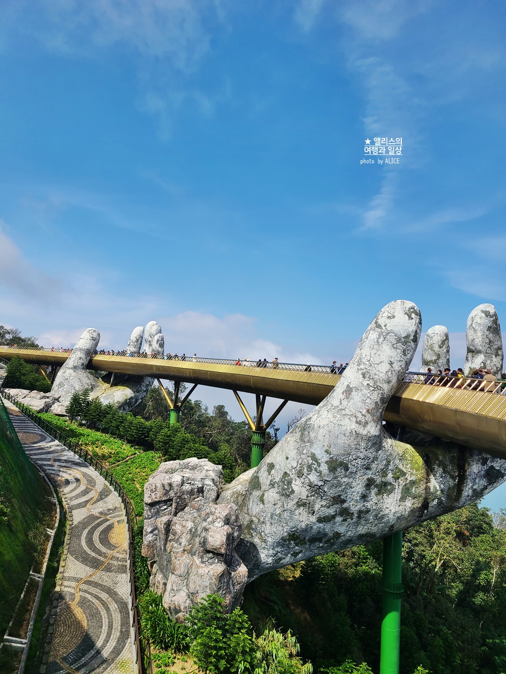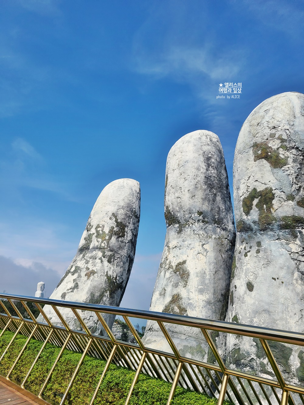 바나힐의 대표 명소인 골든브릿지. 황금손이라고도 부르는데 손 색깔이 황금이라서가 아니라 황금색 띠를 잡고 있는 신의 손이라고 해서 골든 브릿지라고 보른다. 즉, 다리는 금색, 그것을 잡고 있는 것은 신의 손이라는 뜻이다.