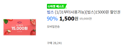 빕스 딸기 퍼레이드가 1월 31일부터 시작된다. 그에 맞춰서 사용할 수 있는 빕스 90% 할인쿠폰. 간편하게 1,500원에 구매 가능하고 언제든지 기간안에 사용가능하다. 필요할 때 사려면 살 수 없는 할인쿠폰이라 이렇게 눈에 띌 때 구매해두는 것이 좋다!