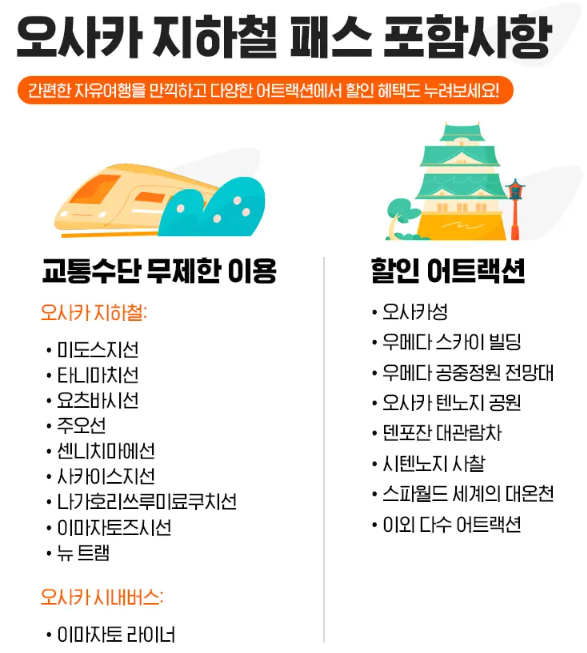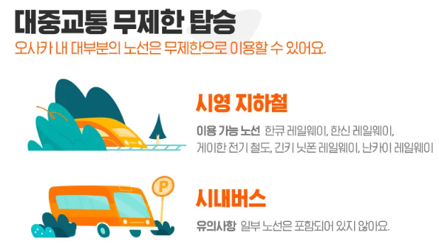 · 오사카 지하철, 트램, 버스 등 다양한 대중교통 무제한 이용