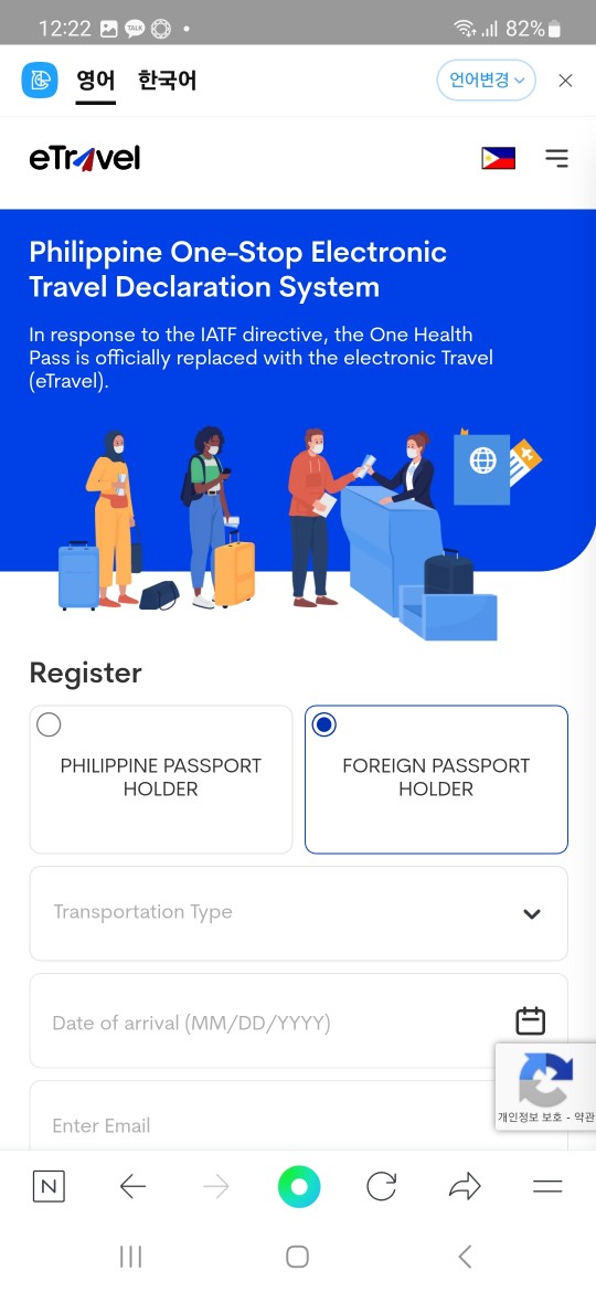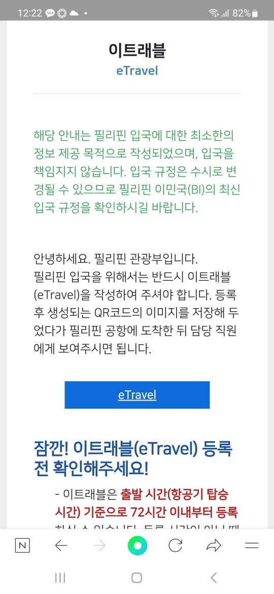 필리핀 입국시 필요한 최소한의 정보를 제공하는 것이 목적이다. 백신접종증명자 또는 음성확인서를 소지한 이라면 이트래블에 직접 등록하며 이외의 정보를 바탕으로 입국시 편리하게 QR코드 하나만으로 입국할 수 있도록 한 입국방식이다. 실제 입력방식은 어렵지 않으나 모두 영어로 되어있어 영어질문에 답변해야한다. 다만 복잡한 영어는 아니며 살짝 헷갈릴 만한 것은 아래에 별도로 정리했으니 참고하자.