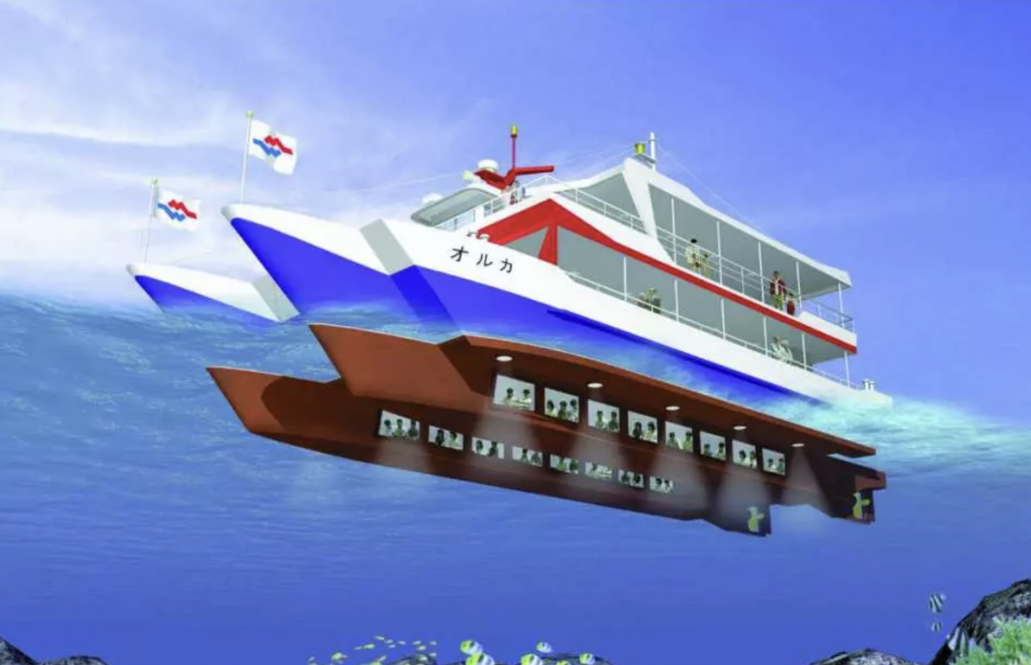 글래스 보트인 수중관광선 오르카. 아주 재미나게도 반잠수식 관광선으로 총 160명을 수용할 수 있으며 전망대는 최대 80명까지 수용가능한 규모가 큰 글래스 보트다. 오르카 범고래 크루즈를 타고 바다 밑의 움직이는 수족관처럼 오키나와 바다의 투명도와 어종을 직접 관찰할 수 있다.