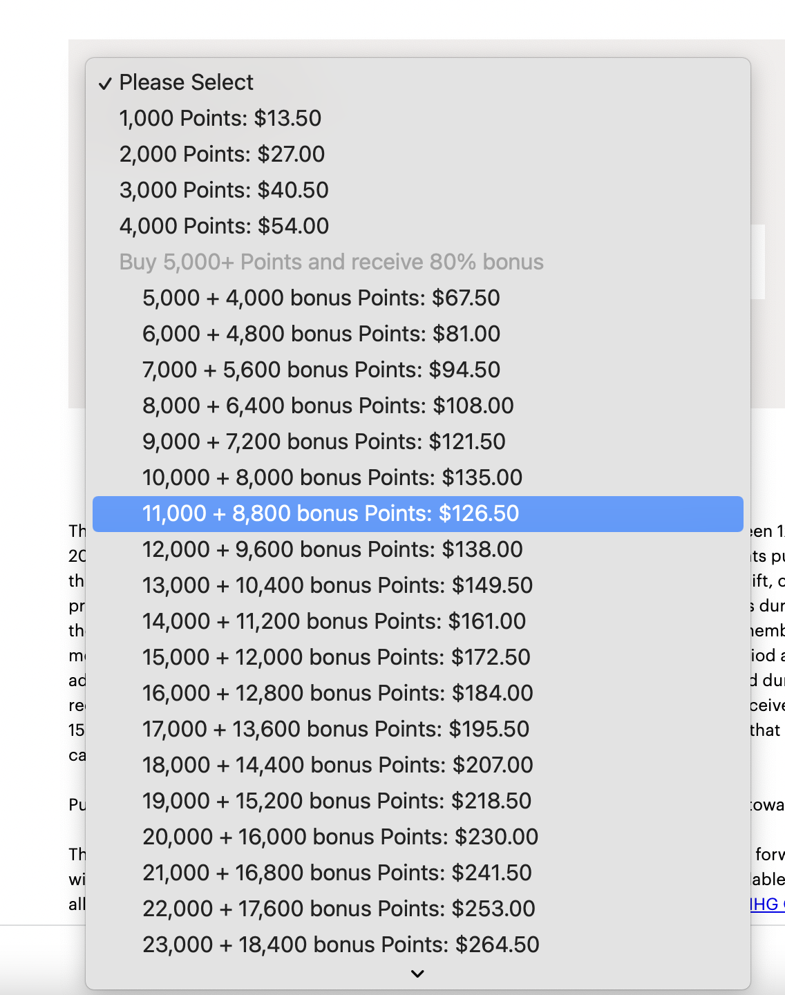 IHG 포인트 프로모션은 아주 특이하게도 자연스레 포인트 구매량이 많을수록 가격이 높아지는 것이 아니라 특정 단계에서는 가격이 역전되는 현상이 나타난다. 그러므로 이왕이면 1만 포인트 구매보다는 1만1천포인트를 구매하는 것이 훨씬 더 저렴하다.