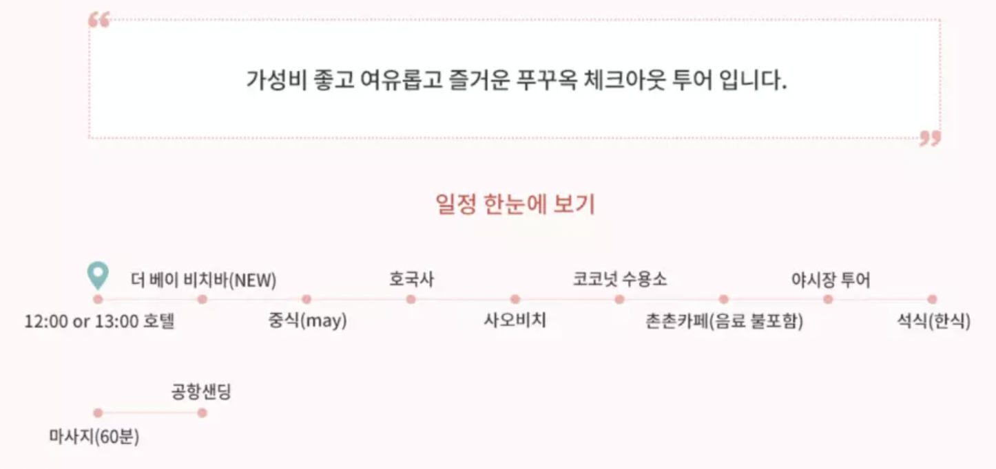 ① 코스: 더 베이 비치바 - 중식 - 호국사 - 사오비치 - 코코넛 수용소 - 촌촌카페 = 야시장 투어 - 석식 - 마사지 - 공항 샌딩