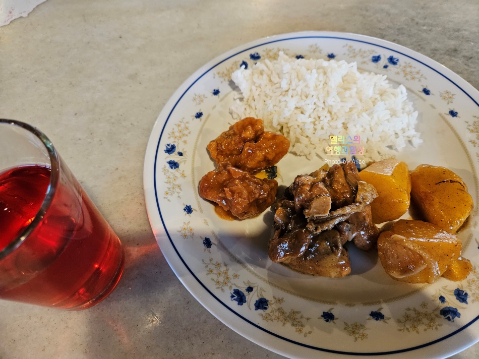 하얀 밥과 치킨볶음, 생선탕수육과 같은 새콤달콤 소스에 버무린 생선튀김, 면볶음 등. 간단한 수박도 준비되어있었다. 배가 고팠던 찰나였으니 저녁식사를 맛있게 먹었다.
