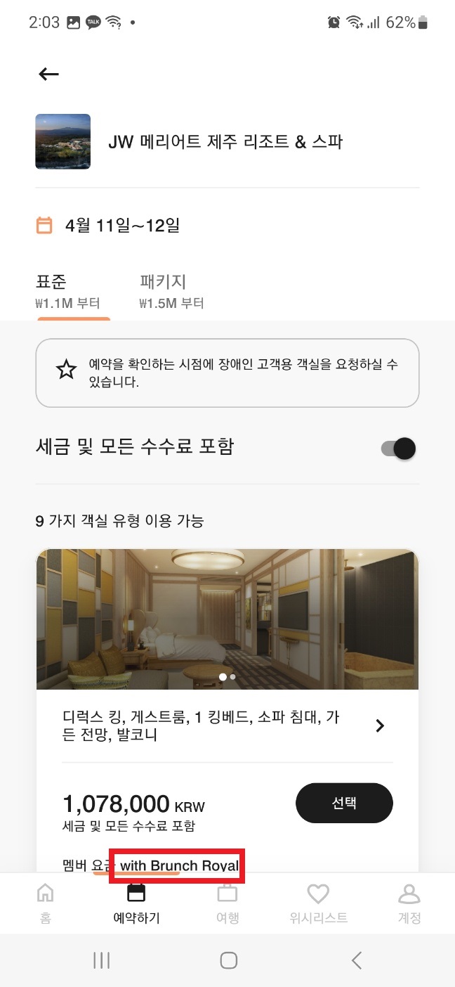 현재 유상으로 JW 메리어트 제주 리조트를 예약할 경우 위에 빨간색 박스를 확인할 수 있다.