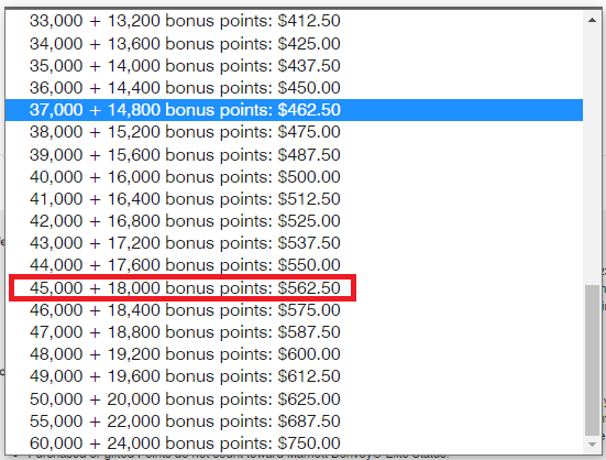 45,000포인트를 구매하면 보너스 40% 더해서 총 63,000포인트를 구매할 수 있다. 현재 가격은 562.50달러. 이 글을 쓰는 시점을 기준으로 환율적용해보면 743,529원