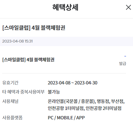 코로나19 이전에는 신세계면세점을 주로 이용했다가 최근에는 롯데면세점을 주로 이용하고 있었다. 그러다가 발견한 신세계면세점 이벤트. 스마일클럽 회원은 누구나 블랙등급으로 신세계 면세점을 이용할 수 있는 혜택이 주어진다. 블랙등급은 조금 더 할인을 받을 수 있어서 꽤나 유용한데 무료라니!