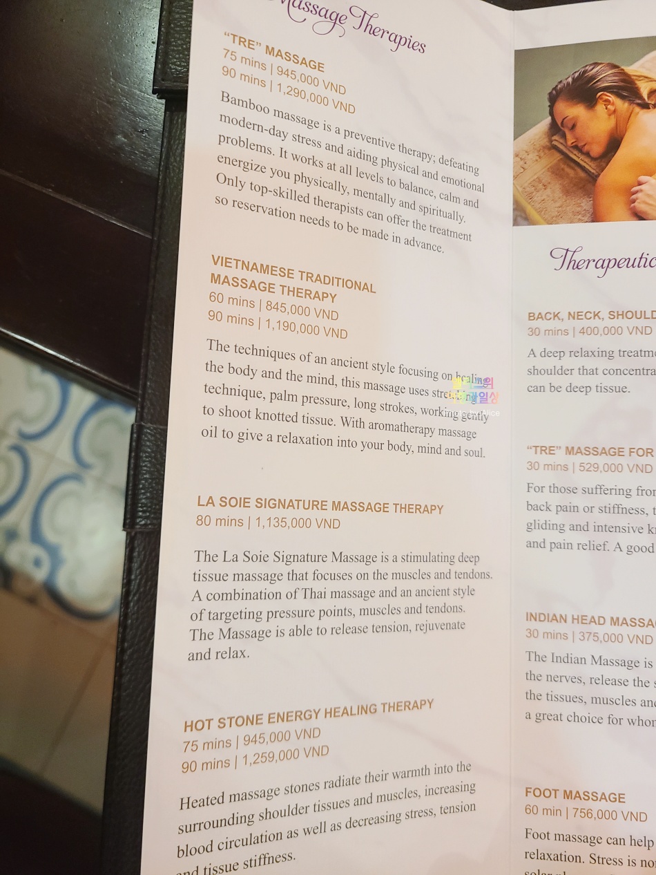 직원들의 친절함은 거의 디폴트일정도로 베트남에서는 호텔이나 리조트 내 스파 직원들은 모두 상당히 친절하다. 내가 없을 때 부모님 두 분만 발마사지를 따로 받았는데 말이 통하지 않아도 정말 편리하여도 좋았다고 부모님이 칭찬을 많이 하셨다.
