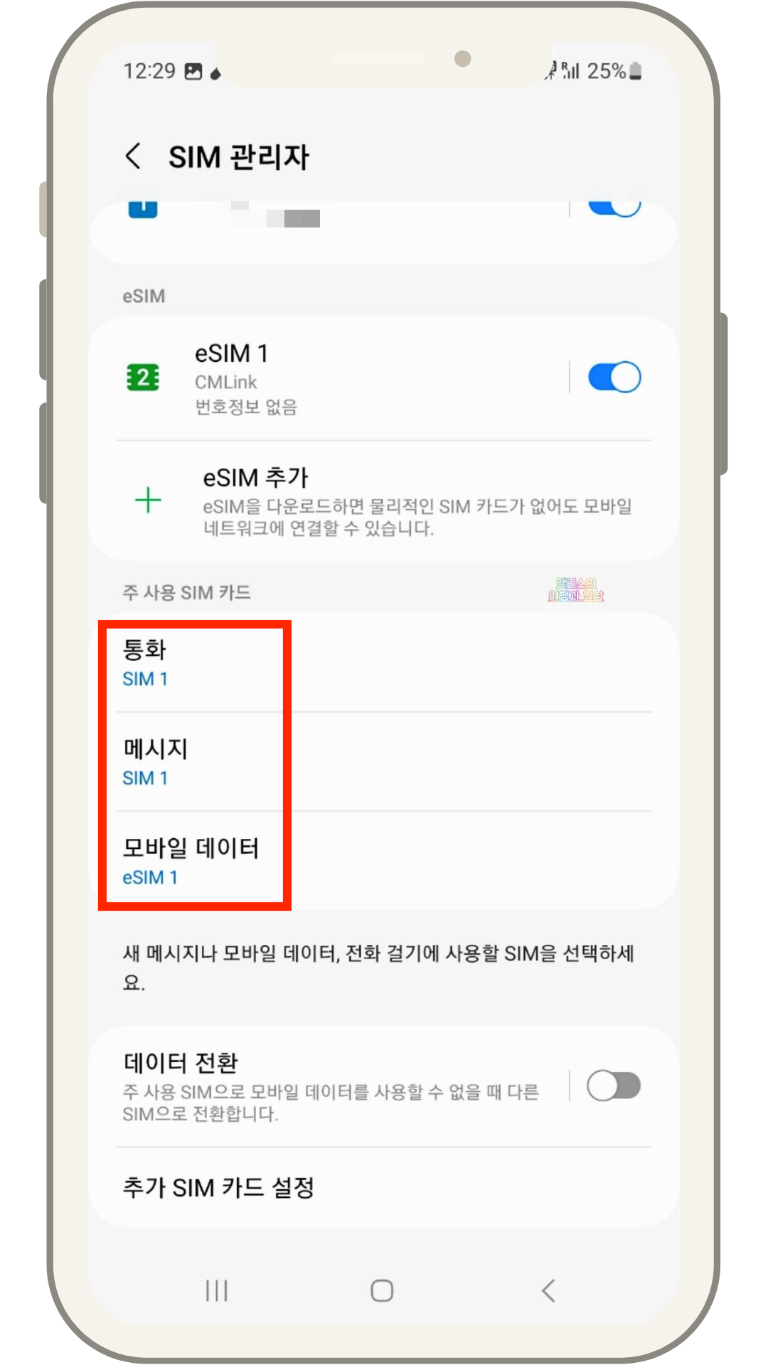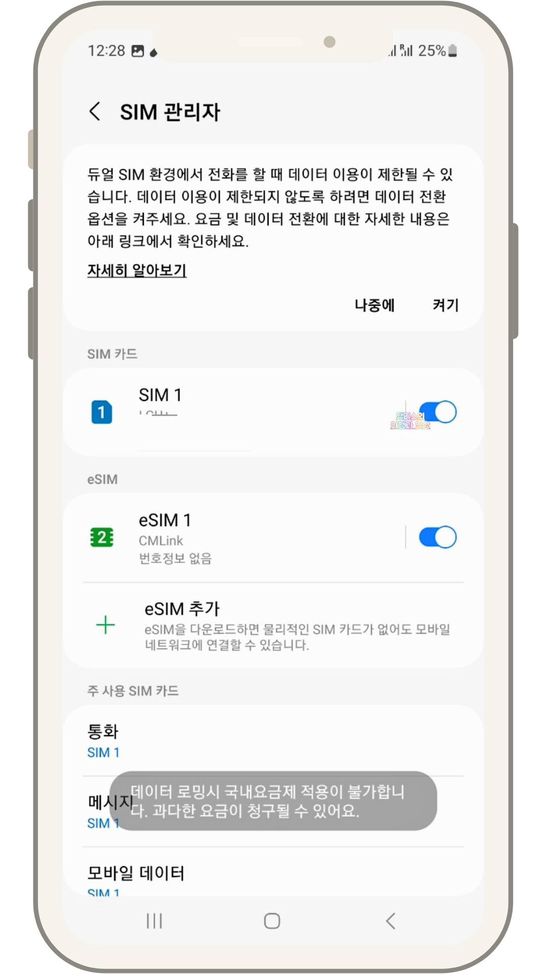 통화, 메시지는 SIM1로 그대로 두고