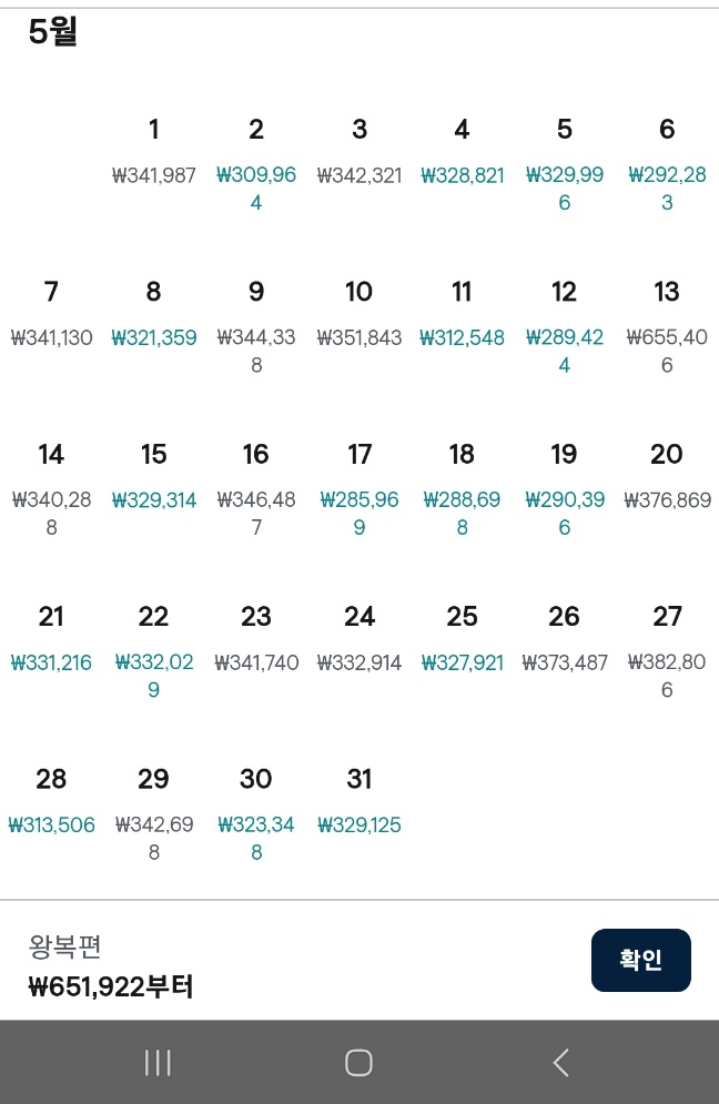 모든 날짜를 다 확인해보진 못했지만 내가 확인해 본 바로는 서울 출발 기준 (1회 아부다비 경유) 1인 기준 왕복 항공권 요금을 50~60만 원대에 구매할 수 있음을 확인했다.