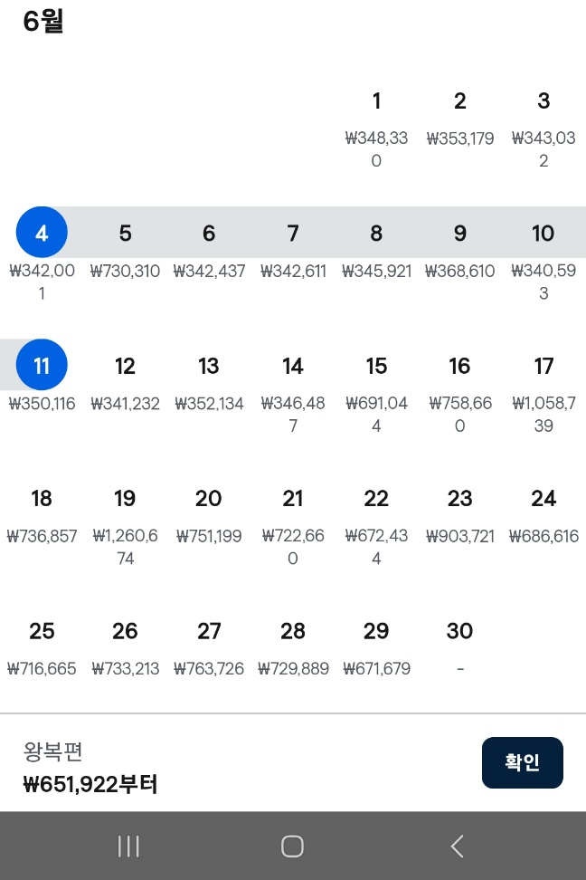모든 날짜를 다 확인해보진 못했지만 내가 확인해 본 바로는 서울 출발 기준 (1회 아부다비 경유) 1인 기준 왕복 항공권 요금을 50~60만 원대에 구매할 수 있음을 확인했다.