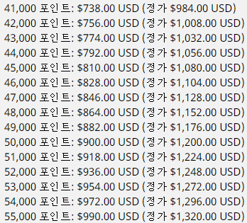 - 2만 5천 포인트 = 600,000원 → 포인트 결제시 45.9% 할인