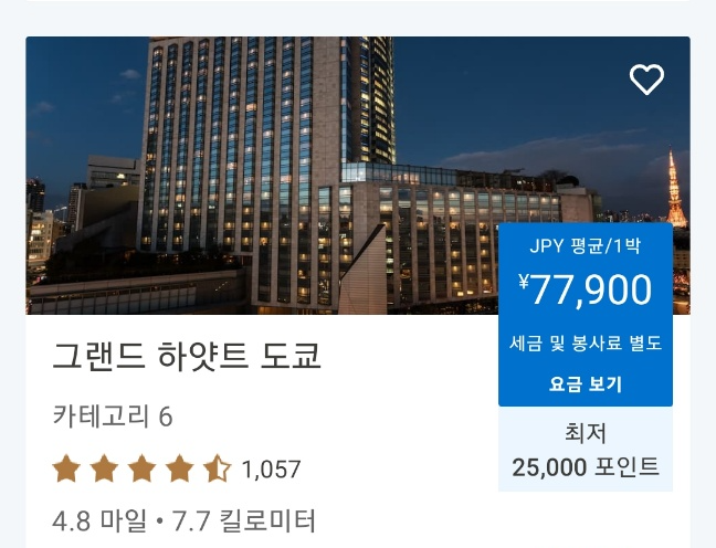 지역마다 도시마다 카테고리에 따라서 차이가 있는 평균적으로 카테고리 1 또는 7~8에 해당하는 경우가 가장 유리하다. 직접 돈으로 결제하는 숙박보다 포인트로 결제하는 것이 훨씬 더 저렴하게 예약 가능하다. 아래의 경우 각 도시의 하얏트 호텔 그룹의 몇 개만 확인해 본 결과다.