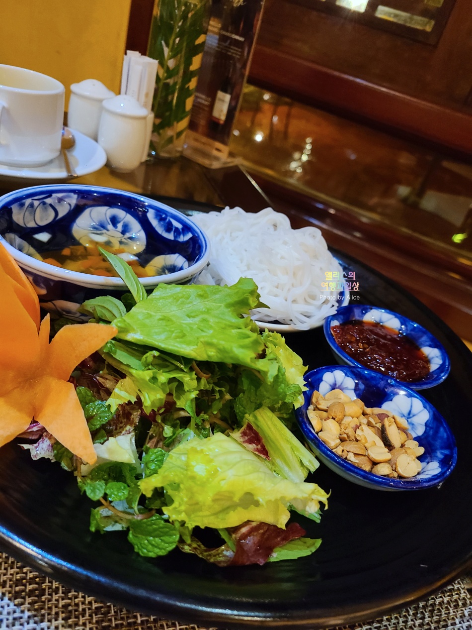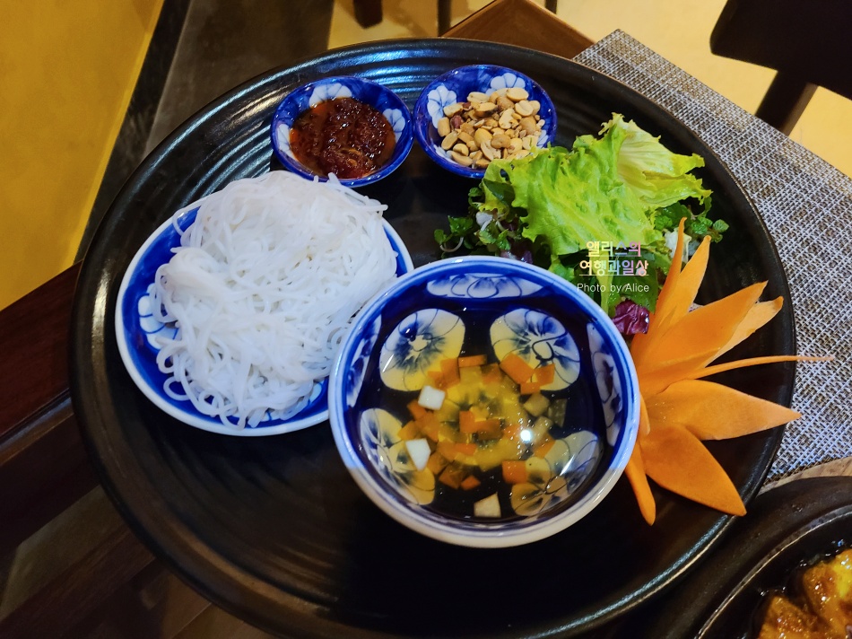 해산물과 채소로 잘 구워 뜨거운 팬에 올려진 음식으로 해산물을 좋아하고 채소 섭취를 즐긴다면 정말 맛있게 먹을 수 있는 메뉴였다. 여기에 서비스로 분짜 스타일의 쌀국수가 제공되기에 먹기에도 좋고 배불리 먹기에 안성맞춤이었다. 밥대신 쌀국수가 포함된 메뉴라고 보면 된다.