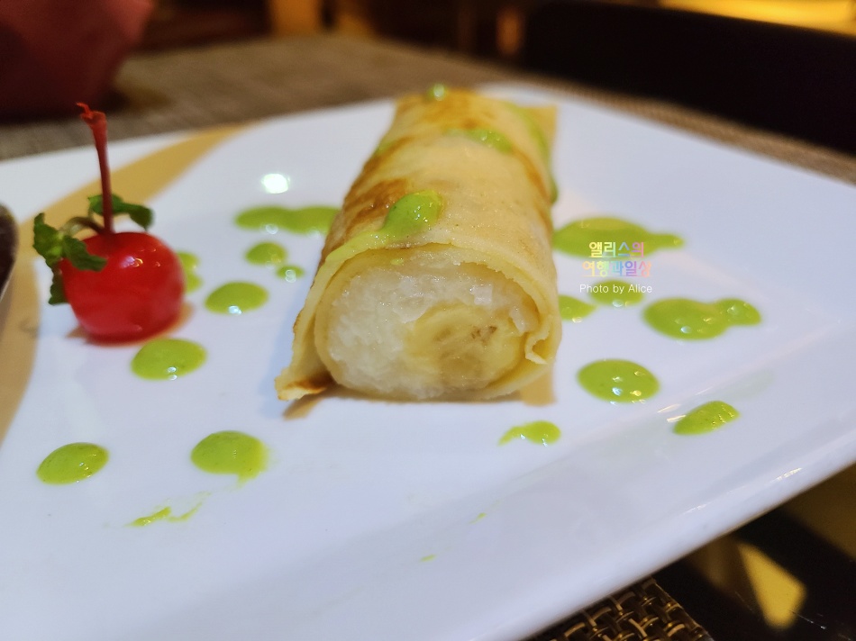 디저트로 먹기 좋았던 쫄깃한 구운 바나나. 우리 음식으로 설명하자면 찹쌀이 들어간 바나나 롤이다.