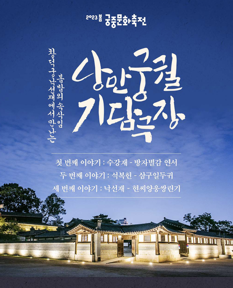 - 2023 궁중문화축전 개막제: 4월28일 19:30~21:00 / 사전예약 600명, 현장참여 200명(예정) /