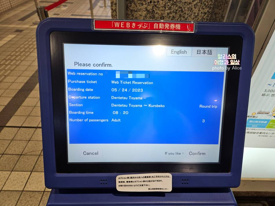 WEB티켓을 클릭해서 회원가입 후 원하는 날짜, 원하는 교통편, 원하는 출발시간을 선택하면 된다. 나의 경우 도야마 시에서 출발하고, 쿠로메댐까지 돌아본 뒤 그대로 되돌아오는 루트는 선택했기에