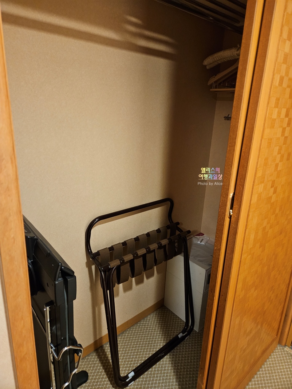옷장은 입구에 바로 있는데, 공간이 너무 좁지 않아서 여행가방이나 짐을 둘 수 있었다. 다림대판이랑 다리미, 그리고 별도의 접이식 여행가방 거치대고 들어있었다.