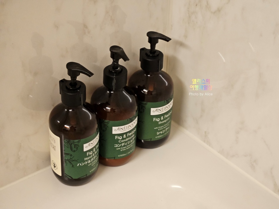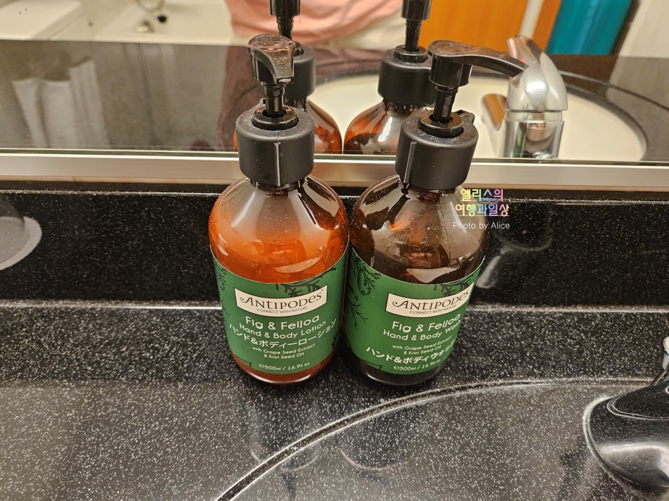 세면대는 좌우 공간이 충분히 넓고 수전이 너무 튀어나오지도 들어가지도 않아서 사용하는 데 불편함이 전혀 없었다. 비누는 없지만 핸드/페이스 소프가 대용량으로 준비되어 있고 이 외의 무료 어매니티도 충분히 제공하고 있었다.