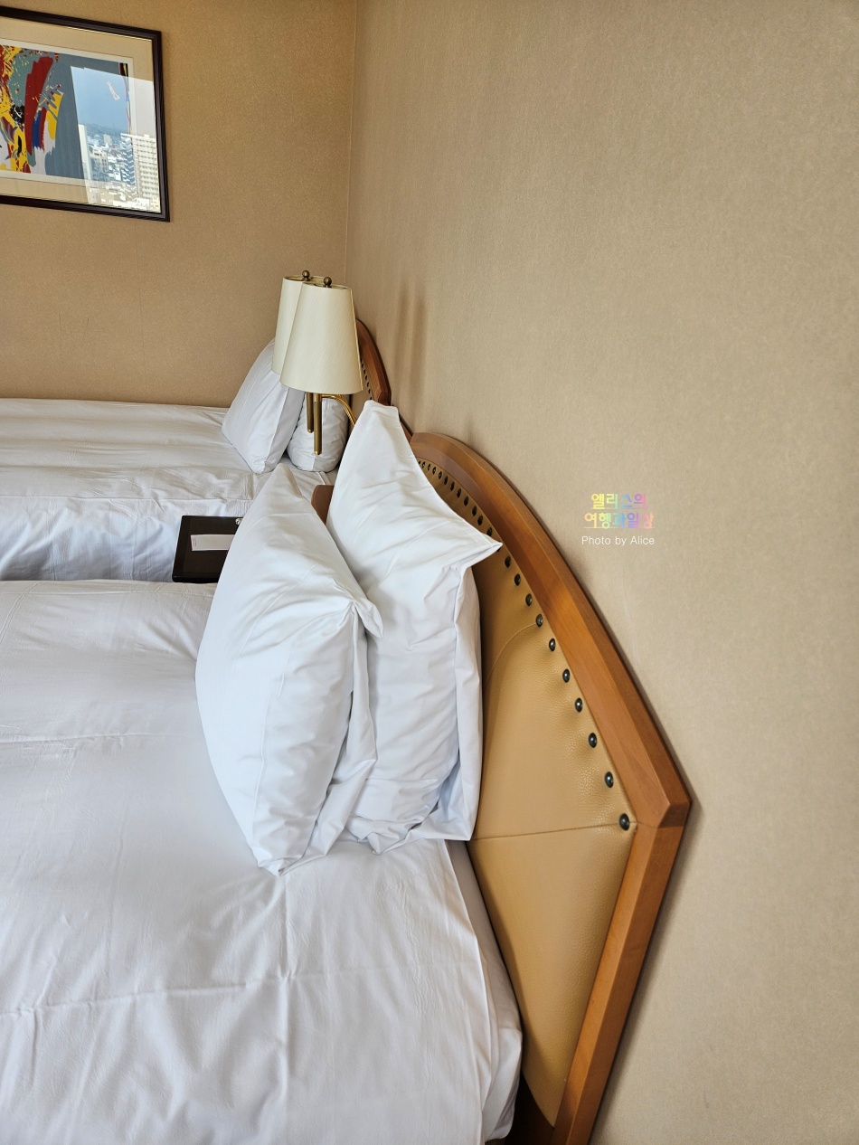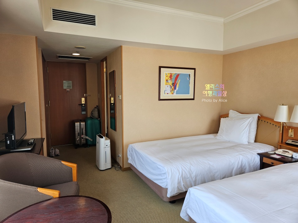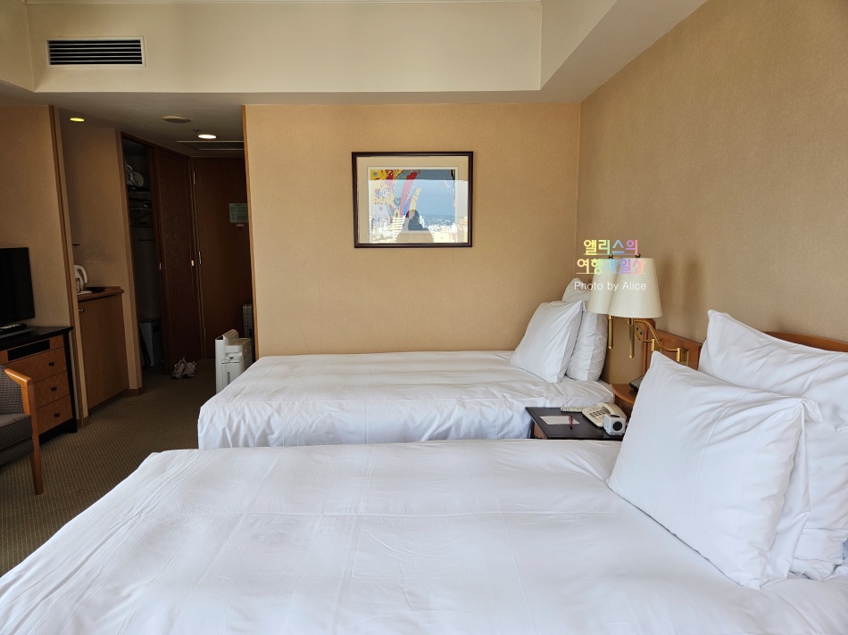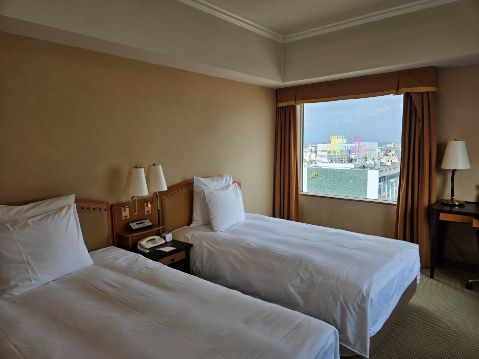 한눈에 들어오는 트윈베드와 함께 책상과 테이블은 별도. 사이즈도 적당하게 크면서 객실 공간을 너무 차지하지 않아서 좋았다. 하지만 동일 더블 프리미엄룸이었던 부모님 방에는 별도의 테이블은 없었다는 점 참고하자.