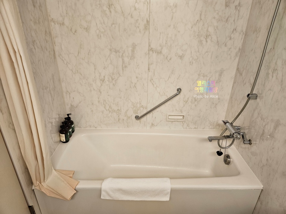 욕실은 생각보다 좁지 않았다. 성인 2명이 들어와도 충분하며 세면대 공간도 충분히 넓어서 무척 만족스러웠다.