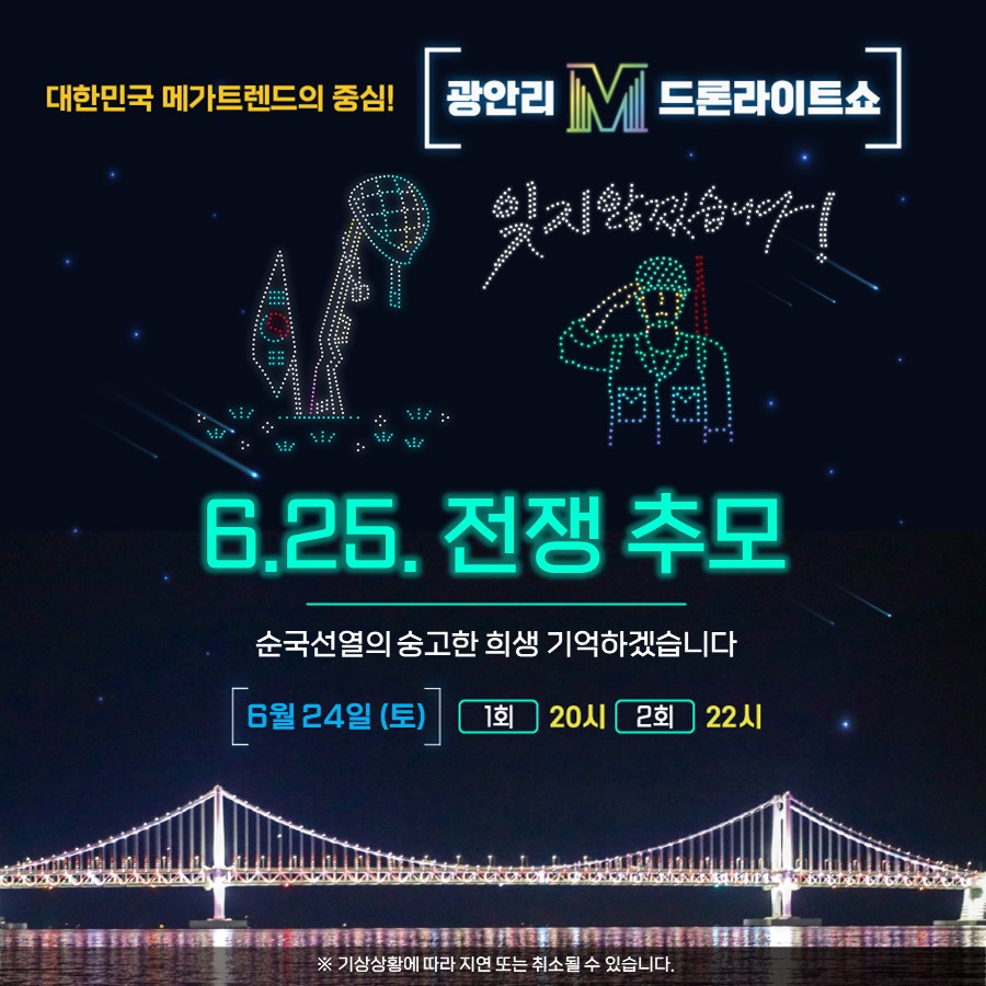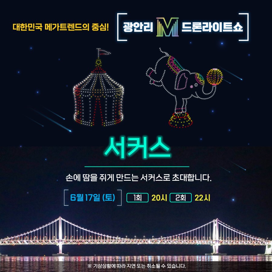 「광안리 M 드론라이트쇼」는 전국 최초로 개최되는 상설 드론라이트쇼로 매주 토요일, 매회 10분 내외로 광안리해변 어디서나 관람이 가능하다. 매주 새롭고 다채로운 콘텐츠와 다양한 시민참여 프로젝트를 통해 희망과 행복의 메시지를 보내니 기회가 된다면 꼭 관람해 보시길~