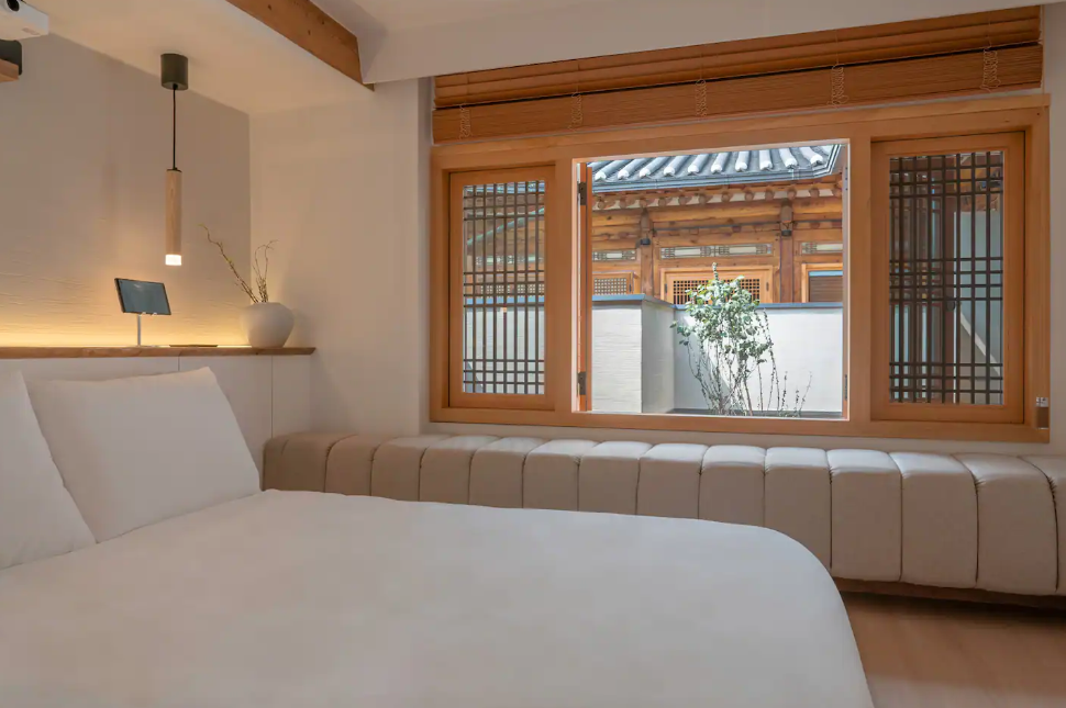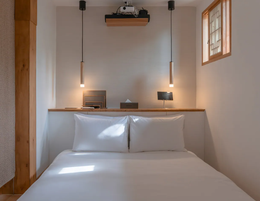 푹신하고 포근한 매트리스와 객실 내 소품들도 한국적인 느낌이 많은 소품들을 보고 있노라면 호캉스와는 또 다른 매력이 느껴지는 곳. 침대 옆 협탁에 노래를 틀 수 있는 태블릿, 충전선 비치되어 있어 편리하게 현대 문명도 즐길 수 있다.