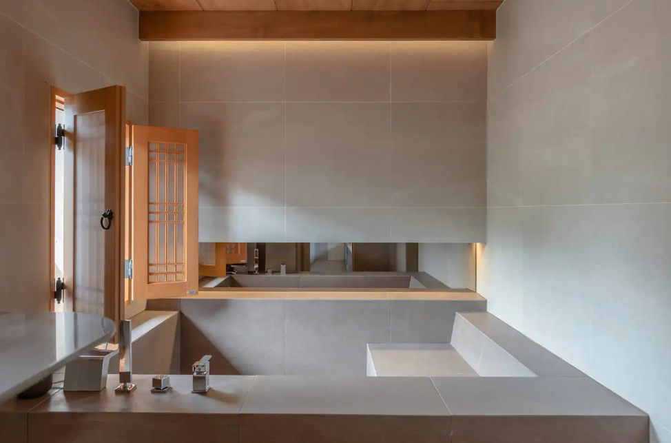 대문을 열고 들어가면 불투명 유리 너머로 자쿠지의 실루엣이 보이는 문향재. 세 발자국 더 들어가면 깔끔한 문향재의 내부가 전부가 한눈에 들어온다. 폴딩도어를 모두 열어두면 내부가 외부가 이어지는 개방성을 확보하고 폴딩도어를 닫으면 잘 독립된 노천탕의 경험을 즐길 수 있는 곳이다.
