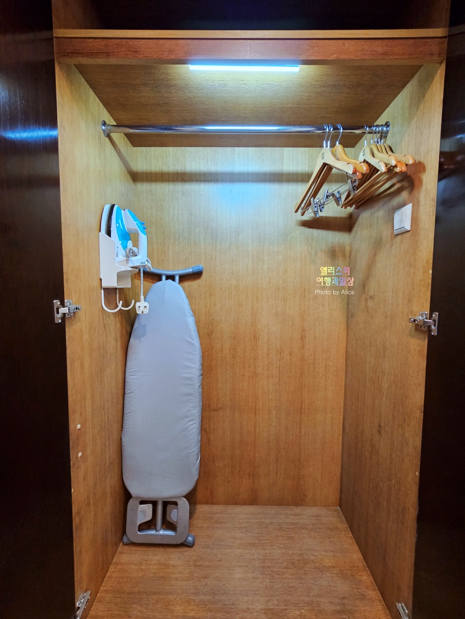 옷장이 마음에 들었던 것은 넓어서다. 정 중앙에 짐을 둘 수 있는 곳과 그 곳을 중심으로 양 옆에 옷장을 두고 있어서 여러 짐을 수납하기에 편리했다. 그리고 기본적으로 준비된 다림질 세트 옷장. 무거운 여행짐도 편리하게 두고 사용할 수 있고 거치할 수 있는 옷장 공간도 넉넉했다.
