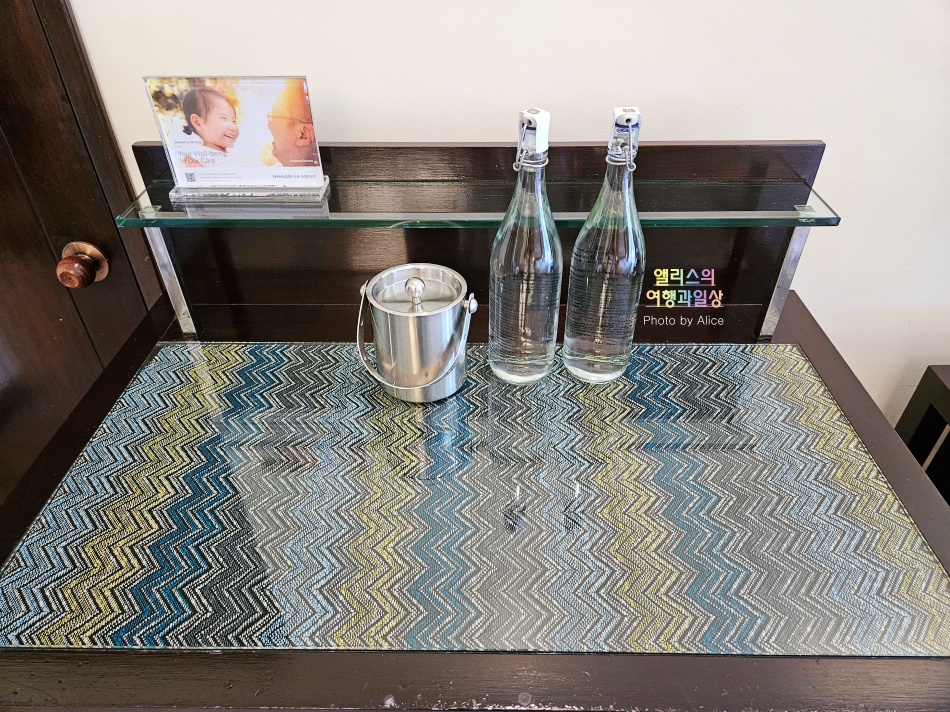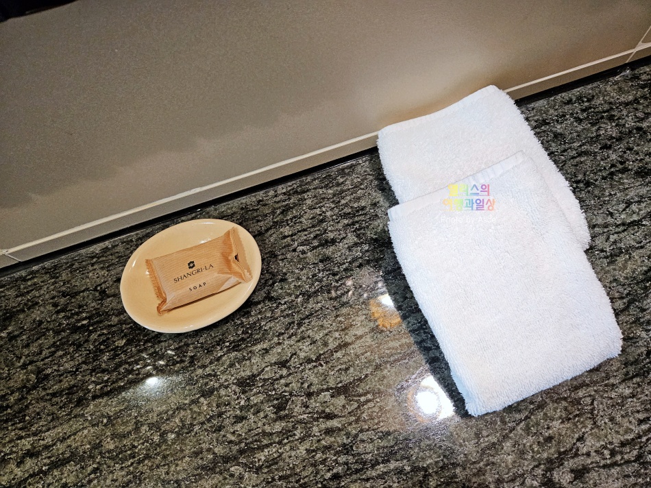 둥근 세면대 덕분에 세면대의 크기는 확보하면서 그대로 이어지는 직사각형 대리석 덕분에 충분히 여유롭게 개인짐을 둘 수 있는 공간도 확보된다. 그리고 여기에 별도 제공하는 무료 어매니티들은 보다시피 작은 선반에 비치되어있어서 대리석 상판 여유공간을 많이 차지하지도 않는다.